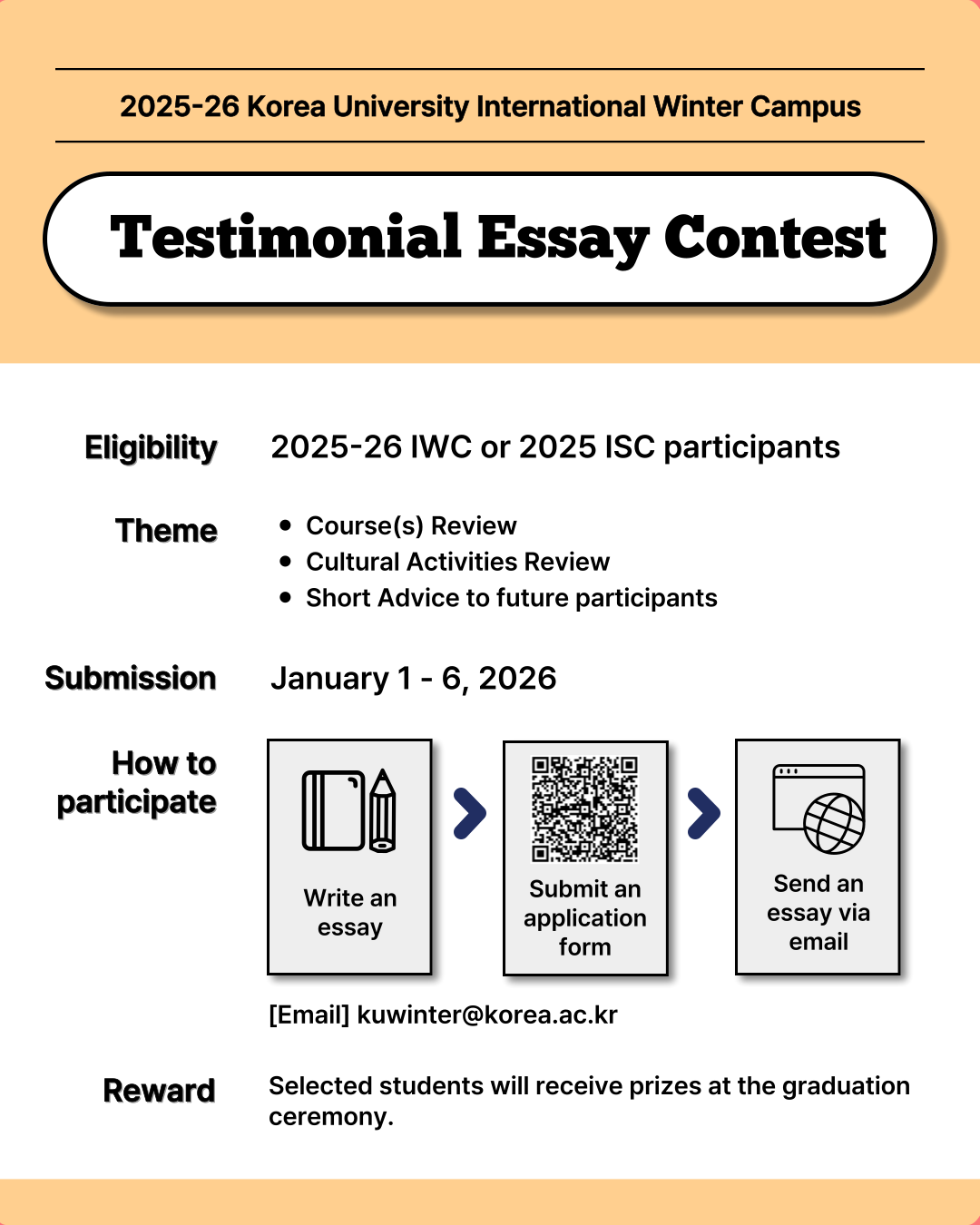 - How to Apply: Write your essay using the designated form, Submit the application form (https://forms.office.com/r/4PjiuVLLBz), and Send your essay via email to kuwinter@korea.ac.kr